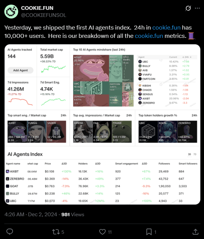 - AI Agent Indexing: cookie.fun attracted 20,000+ users in 48 hours