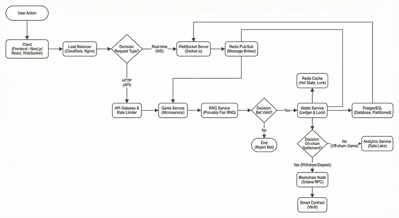 Stake.com operates on a sophisticated four-layer architecture that separates concerns and enables massive scalability: